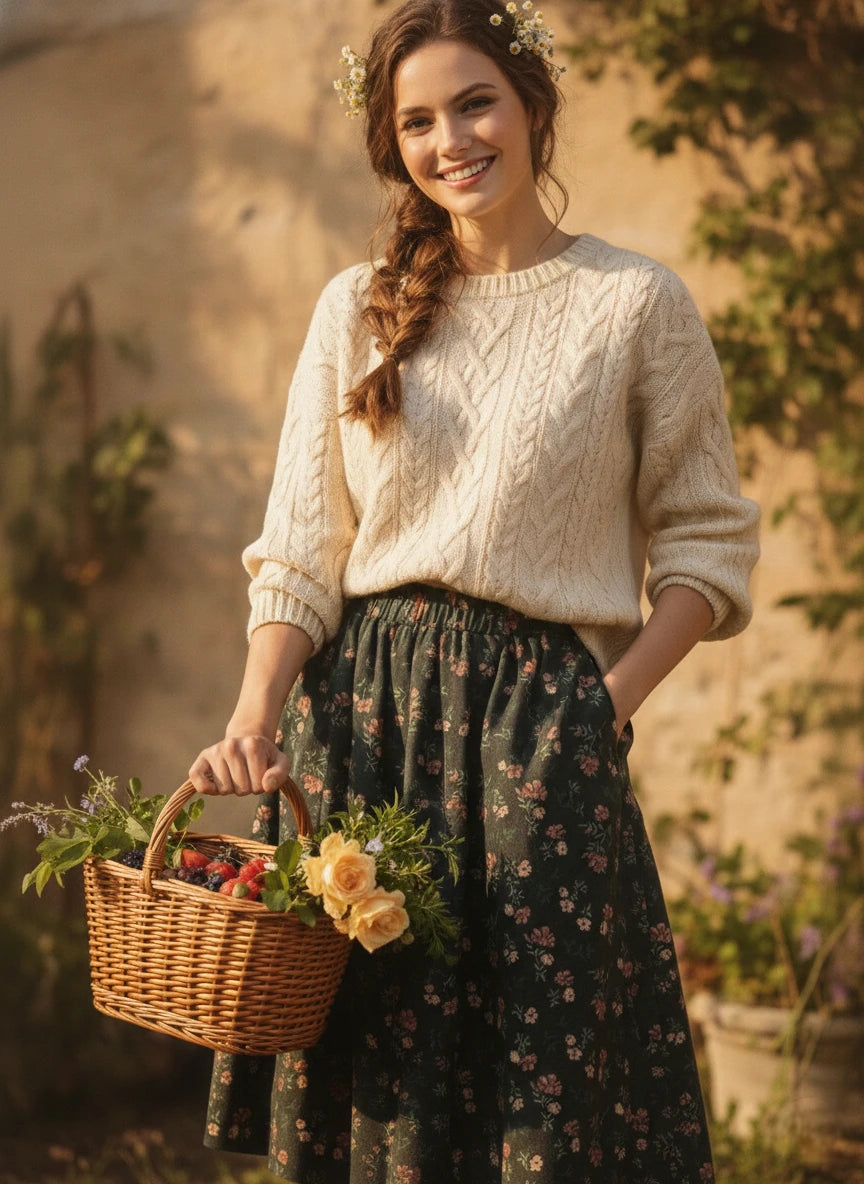A versatile wardrobe staple that pairs beautifully with both relaxed and cottagecore-inspired outfits.